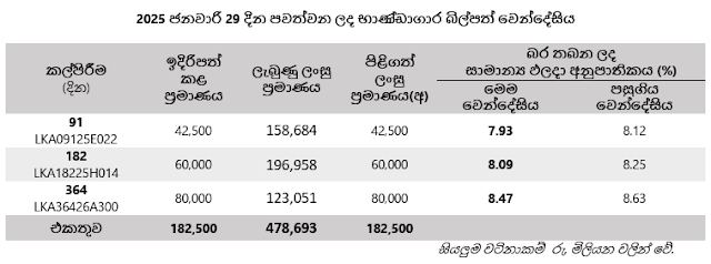 මහ බැංකුව විසින් විශේෂ බලපෑමක් හෝ සංඥාවක් නොකළද, වෙළඳපොළ පොලී අනුපාතික පහත වැටෙමින් තිබෙනවා. අද පැවති භාණ්ඩාගාර බිල්පත් වෙන්දේසියේදී දින-91 (මාස තුන) බිල්පත් ඵලදා අනුපාතිකය 7.93% දක්වා පහත වැටී තිබෙනු දැකිය හැකියි. මේ අයුරින් වෙළඳපොළ පොලී අනුපාතික මහ බැංකුවේ ඉලක්ක පොලී අනුපාතිකයද ඉක්මවමින් 8% මට්ටමෙන් පහතට වැටී තිබෙන්නේ විශාල කාලයකට පසුවයි. දින-364 (වසර-1) ඵලදා අනුපාතිකයද 8.47% දක්වා පහත වැටී තිබෙනවා.