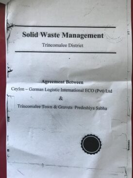 කෙසේ නමුත්, කසළ අංගනය පවත්වා ගෙන යනු ලබන සමාගමේ විරෝධය හමුවේ එම ව්යාපෘතිය හකුළා ගැනීමට ත්රිකුණාමලය නගර හා කඩවත් ප්රාදේශීය සභාවට සිදුවිය. රජය සහ අදාළ සමාගම අතර අත්සන් තබා ඇති අවබෝධතා ගිවිසුමේ පවතින දුර්වලතා එයට හේතු විය. නැගෙනහිර පළාත් හිටපු ප්රධාන අමාත්යවරයෙකුගේ මැදිහත්වීම මත සී.ජී.එල්. ඉන්ටර්නැෂනල් ඉකෝ නමැති පුද්ගලික සමාගමක් වෙත මෙම අංගනය ලබා දී ඇති අතර එහිදී අනුගමනය කළ යුතු ක්රියා පටිපාටියෙන් තොරව මෙම ව්යාපෘතිය ආරම්භ කර ඇති බව සඳුන් රත්නායක මහතා අවධාරණය කරයි.