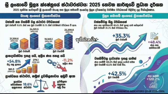 • වත්කම් වර්ධනය – 2025 3 වන කාර්තුව අවසානයේදී බැංකු අංශයේ මුළු වත්කම් ප්රමාණය පසුගිය වසරට සාපේක්ෂව 15.6% කින් වර්ධනය වී රුපියල් බිලියන 24,501.5 ක් වී ඇත. ණය සහ ලැබීම් (Loans and Receivables) මෙන්ම ආයෝජනවල සිදුවූ වැඩිවීම මීට ප්රධාන වශයෙන් හේතු වී තිබේ.