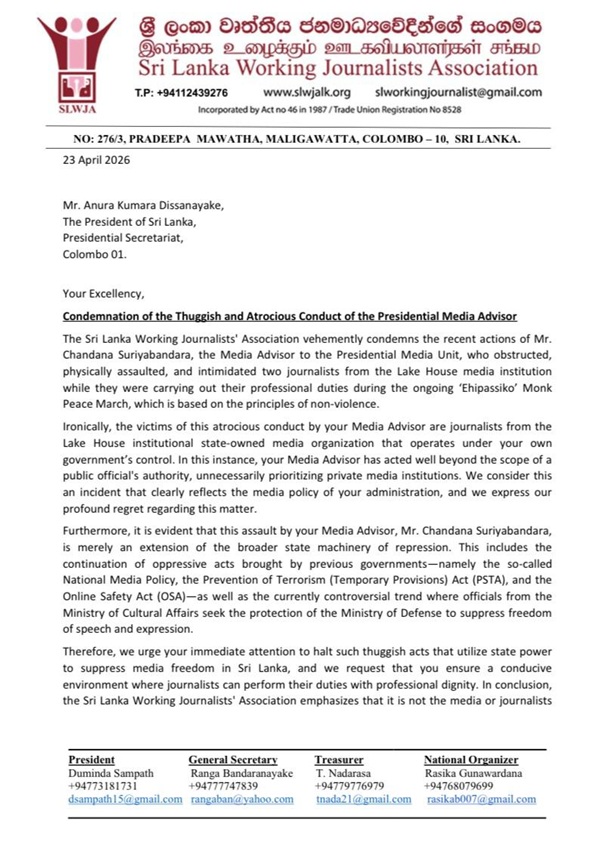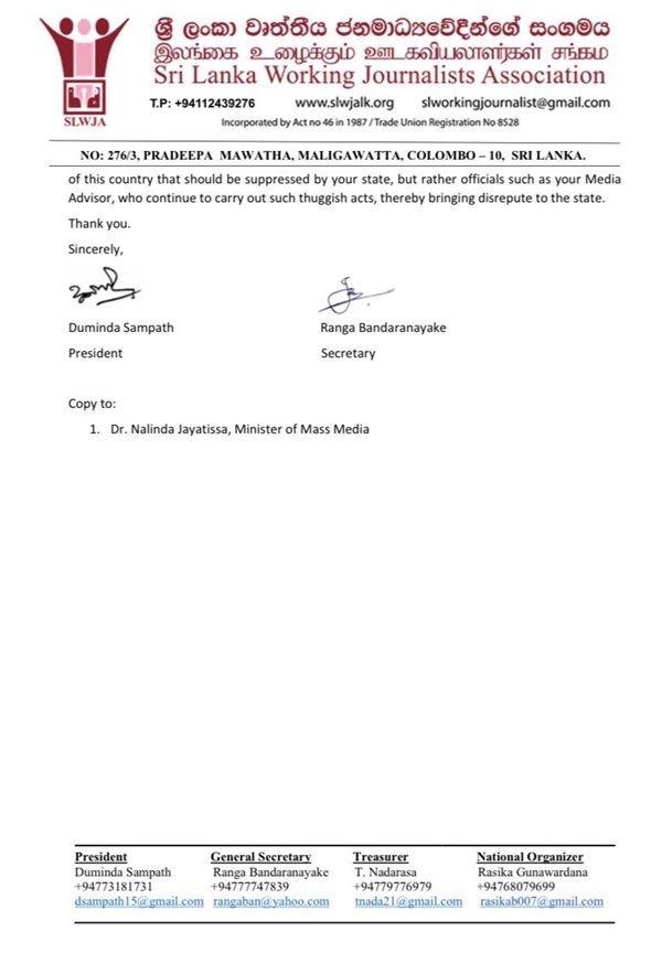 කෙසේ නමුත්, මෙම සිද්ධිය හෙළා දකිමින් ශ්රී ලංකා වෘත්තීය ජනමාධ්යවේදීන්ගේ සංගමය ජනාධිපති අනුර කුමාර දිසානායක වෙත හා ජනමාධ්ය අමාත්ය නලින්ද ජයතිස්ස වෙත ලිපියක් යොමු කර තිබෙනවා. (What News)